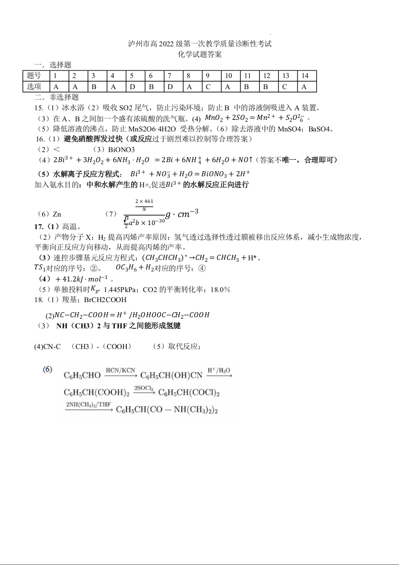四川省泸州市高2022级第一次教学质量诊断性考试化学答案(非官方)