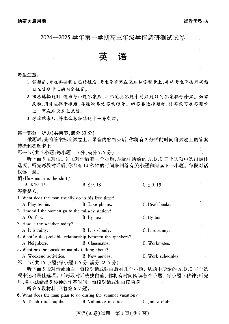 山西省2024-2025学年第一学期高三年级学情调研测试11月期中考试英语