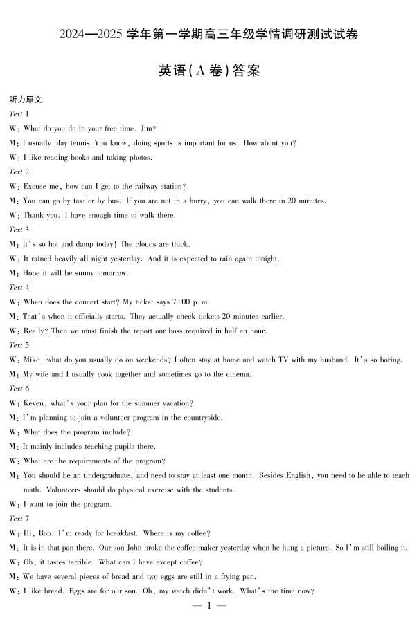山西省2024-2025学年第一学期高三年级学情调研测试11月期中考试英语答案