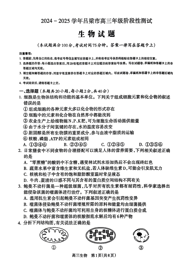 山西省吕梁市2025届高三上学期11月期中考试生物