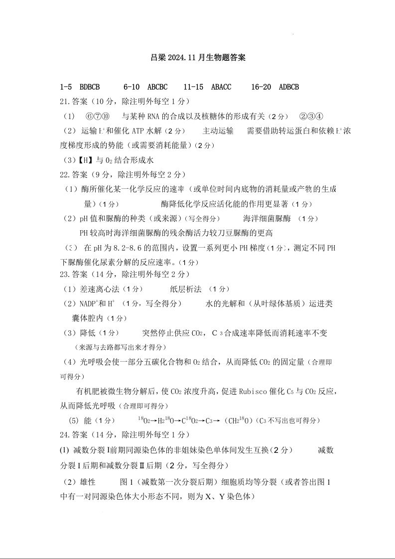 山西省吕梁市2025届高三上学期11月期中考试生物答案