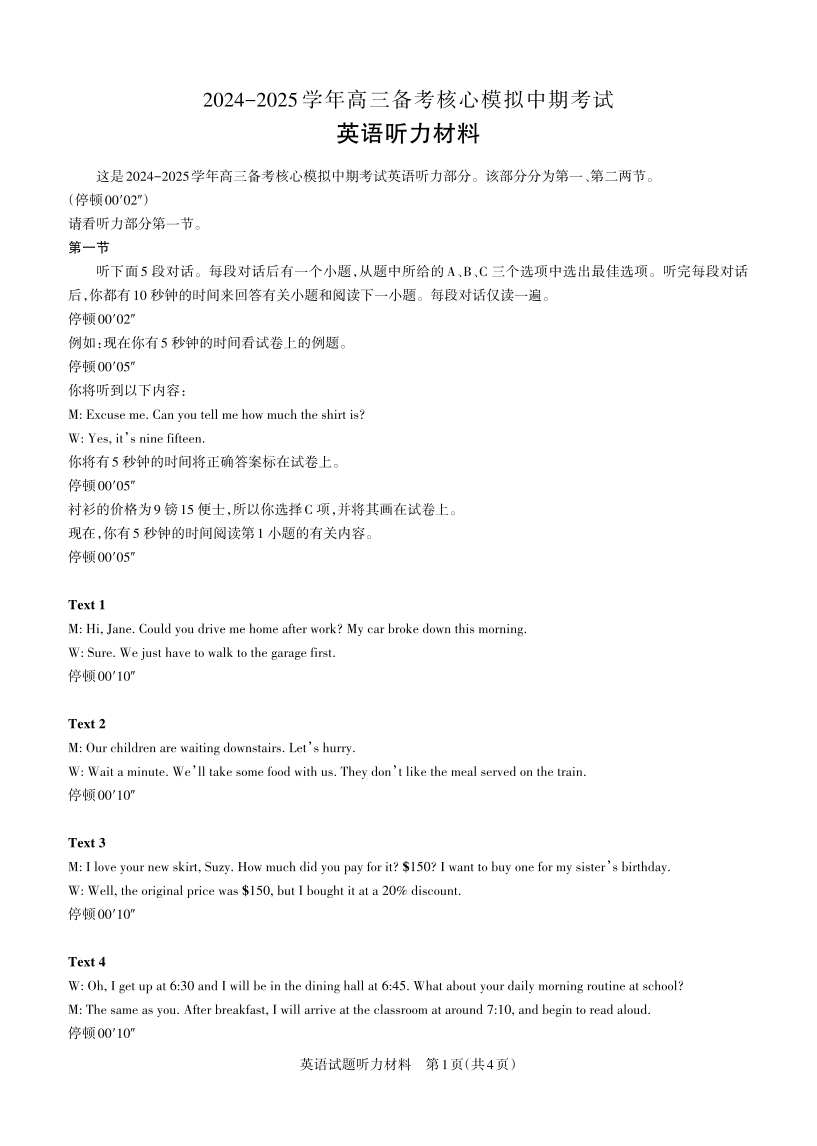 山西省思而行2025届高三备考核心模拟中期考试听力原文