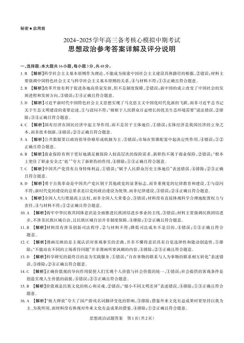 山西省思而行2025届高三备考核心模拟中期考试政治答案