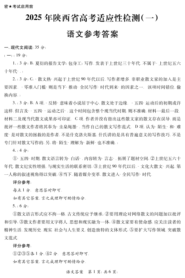 陕西省2025届高考适应性检测(一)语文答案