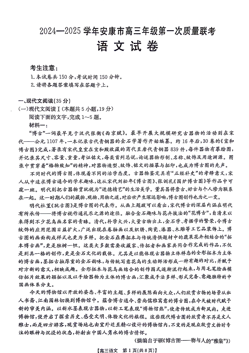 陕西省安康市2025届高三上学期第一次质量联考语文