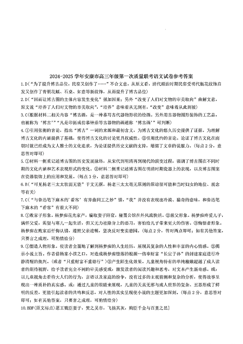 陕西省安康市2025届高三上学期第一次质量联考语文答案