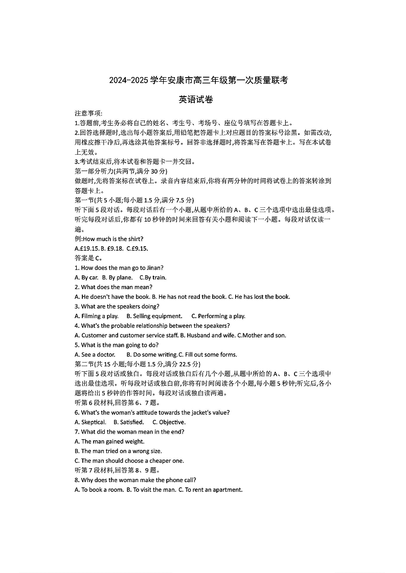 陕西省安康市2025届高三上学期第一次质量联考英语+答案