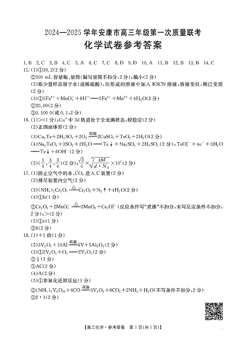 陕西省安康市2025届高三上学期第一次质量联考学答案