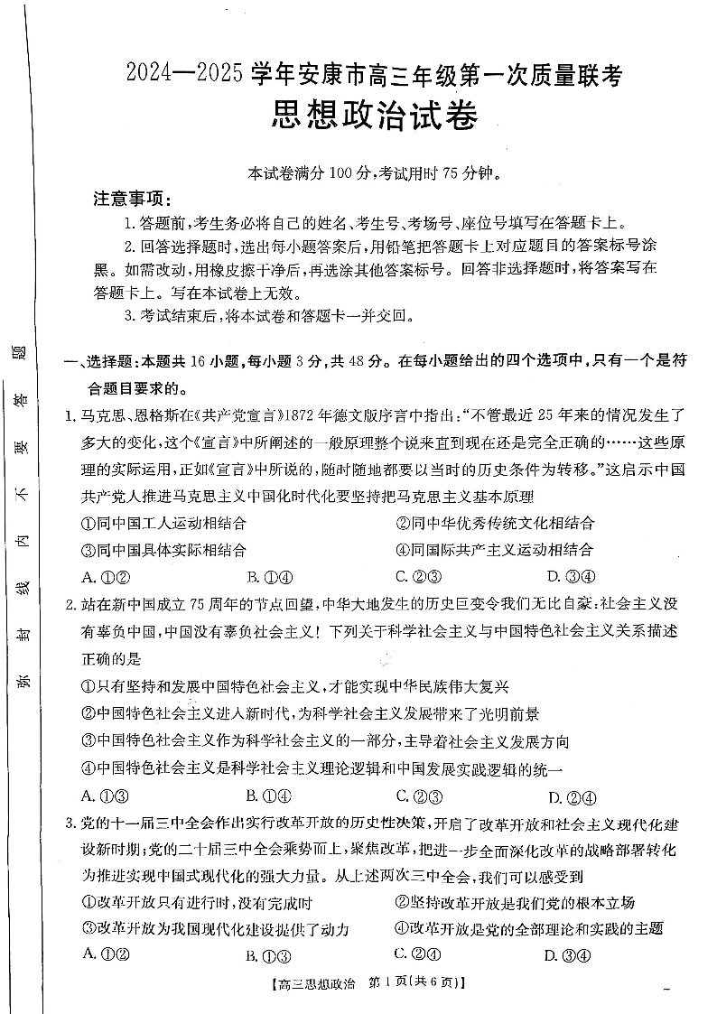 陕西省安康市2025届高三上学期第一次质量联考政治