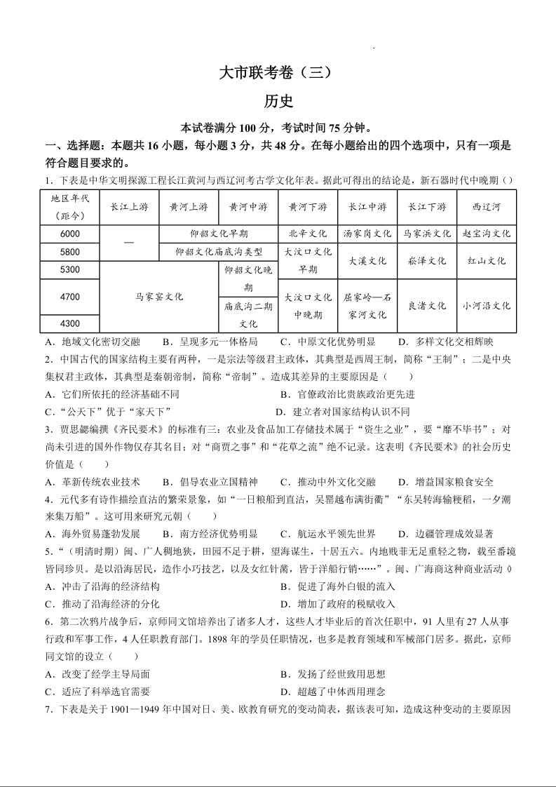 陕西省汉中市2025届高三上学期联考(三)(11月期中)历史+答案