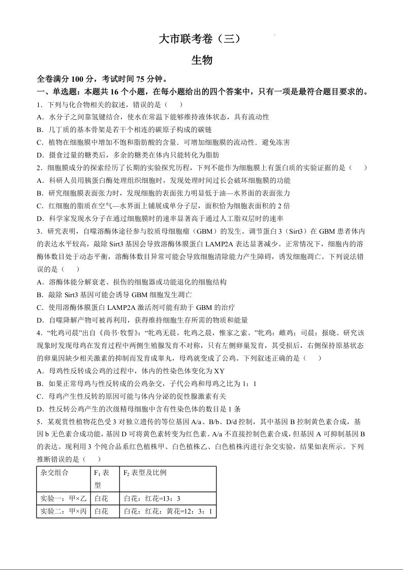 陕西省汉中市2025届高三上学期联考(三)(11月期中)生物+答案