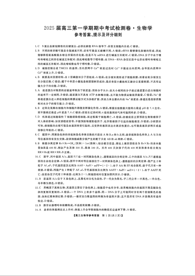 陕西省十七校2025届高三上学期11月期中联考生物答案