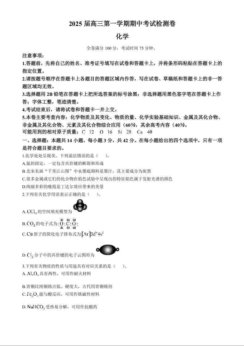陕西省十七校2025届高三上学期11月期中联考化学+答案