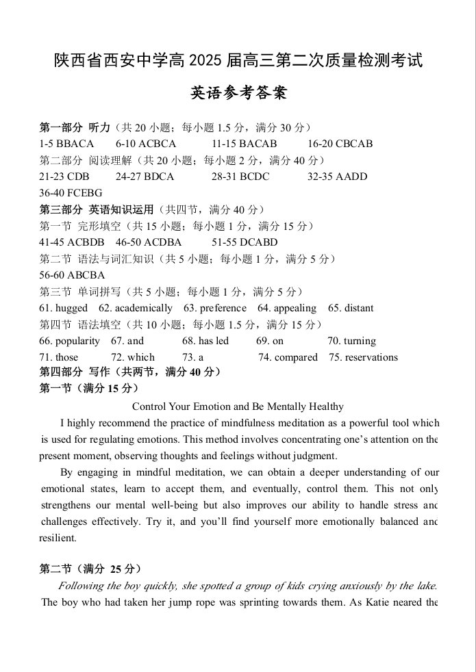 陕西省西安中学2024-2025学年高三上学期第二次调研考试英语答案