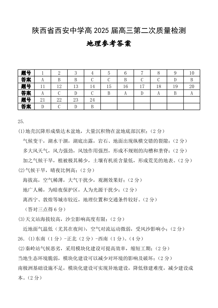 陕西省西安中学2024-2025学年高三上学期第二次调研考试地理答案