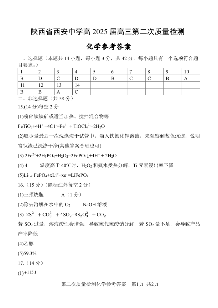 陕西省西安中学2024-2025学年高三上学期第二次调研考试化学答案