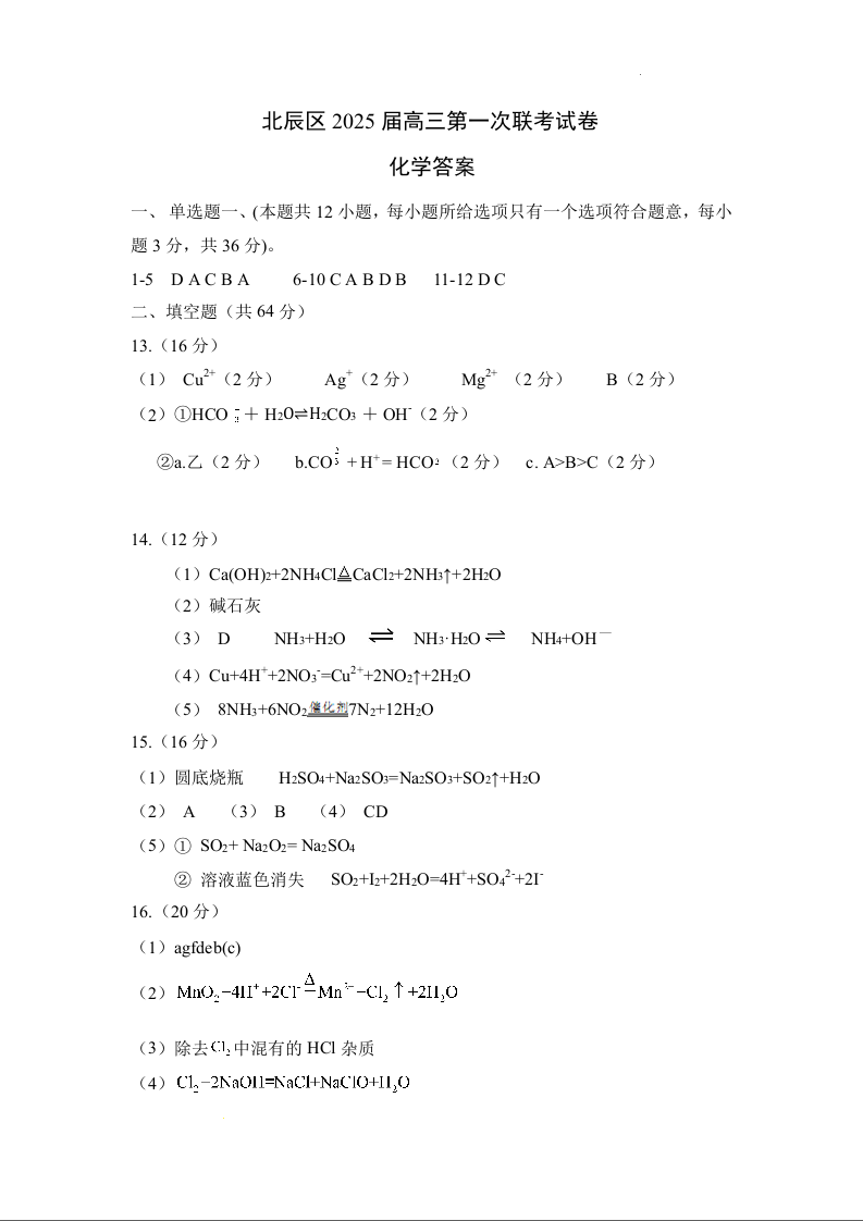 天津市北辰区2025届高三上学期11月期中考试化学答案