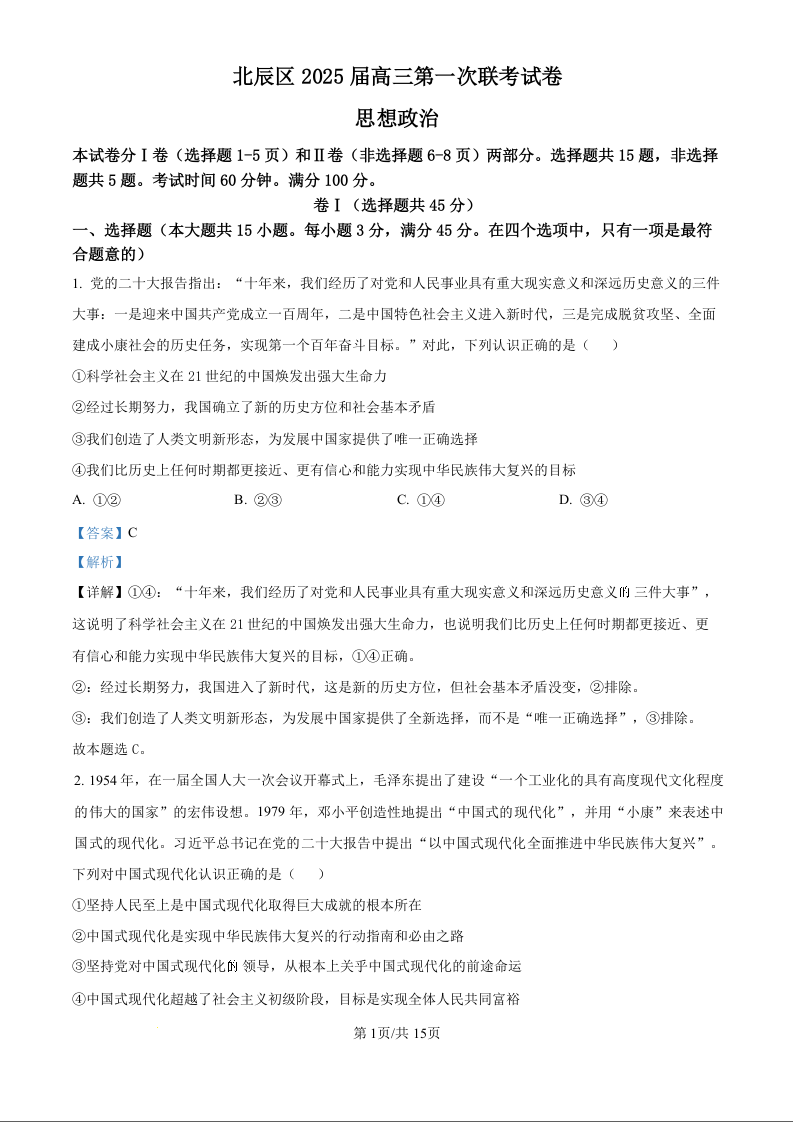 天津市北辰区2025届高三上学期11月期中考试政治(精品解析版)