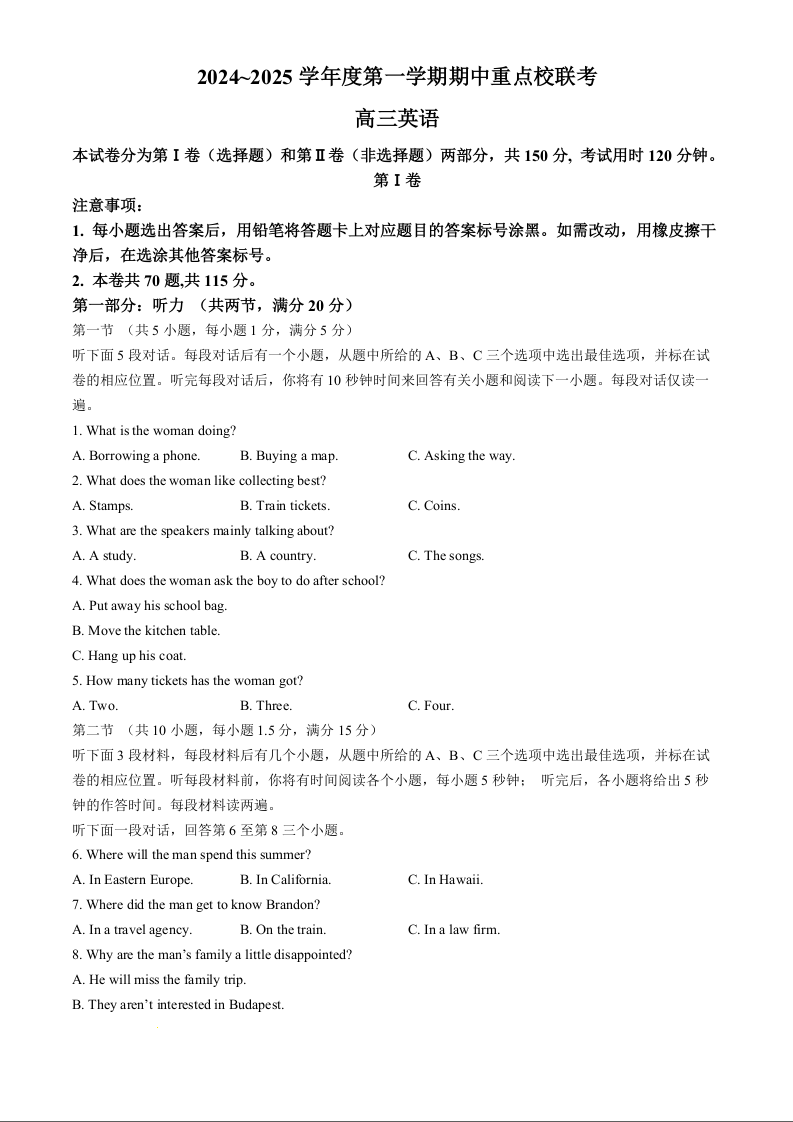 天津市五区县重点校联考2024-2025学年高三上学期11月期中英语+答案