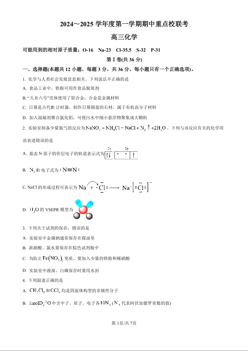 天津市五区县重点校联考2025届高三上学期11月期中考试化学(原卷版)
