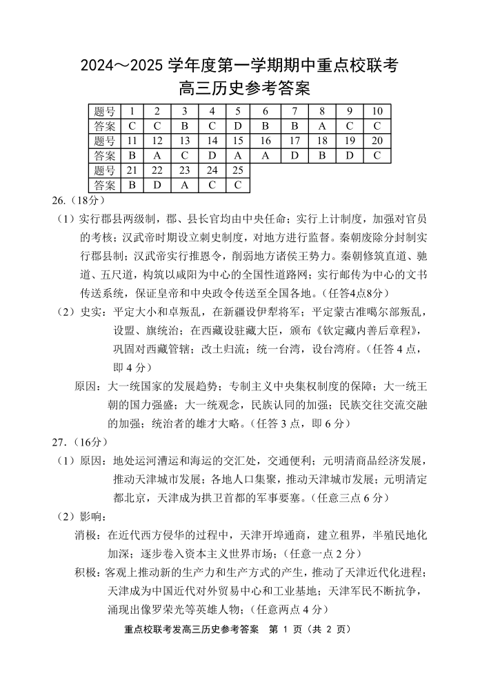 天津市五区县重点校联考2025届高三上学期11月期中考试历史答案