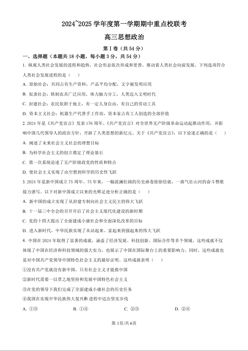 天津市五区县重点校联考2025届高三上学期11月期中考试政治(原卷版)
