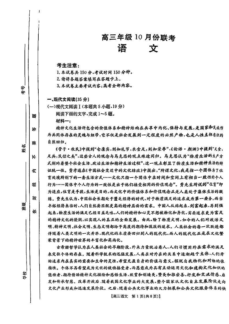 新疆维吾尔自治区片区2025届高三10月联考语文