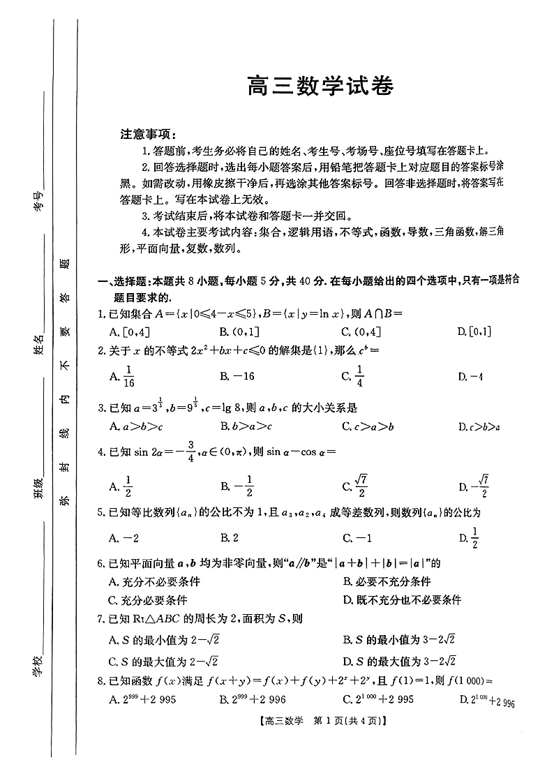 新疆维吾尔自治区片区2025届高三10月联考数学