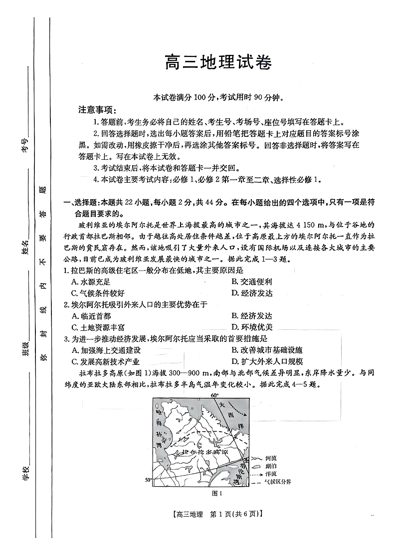新疆维吾尔自治区片区2025届高三10月联考地理