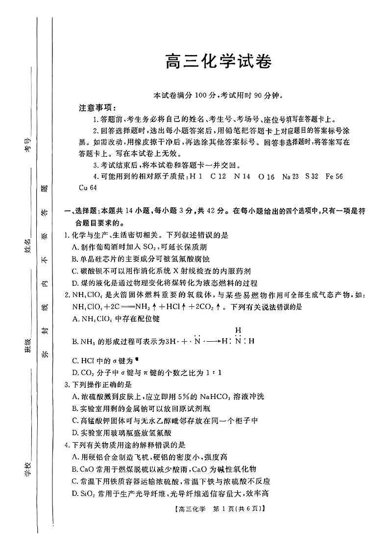 新疆维吾尔自治区片区2025届高三10月联考化学