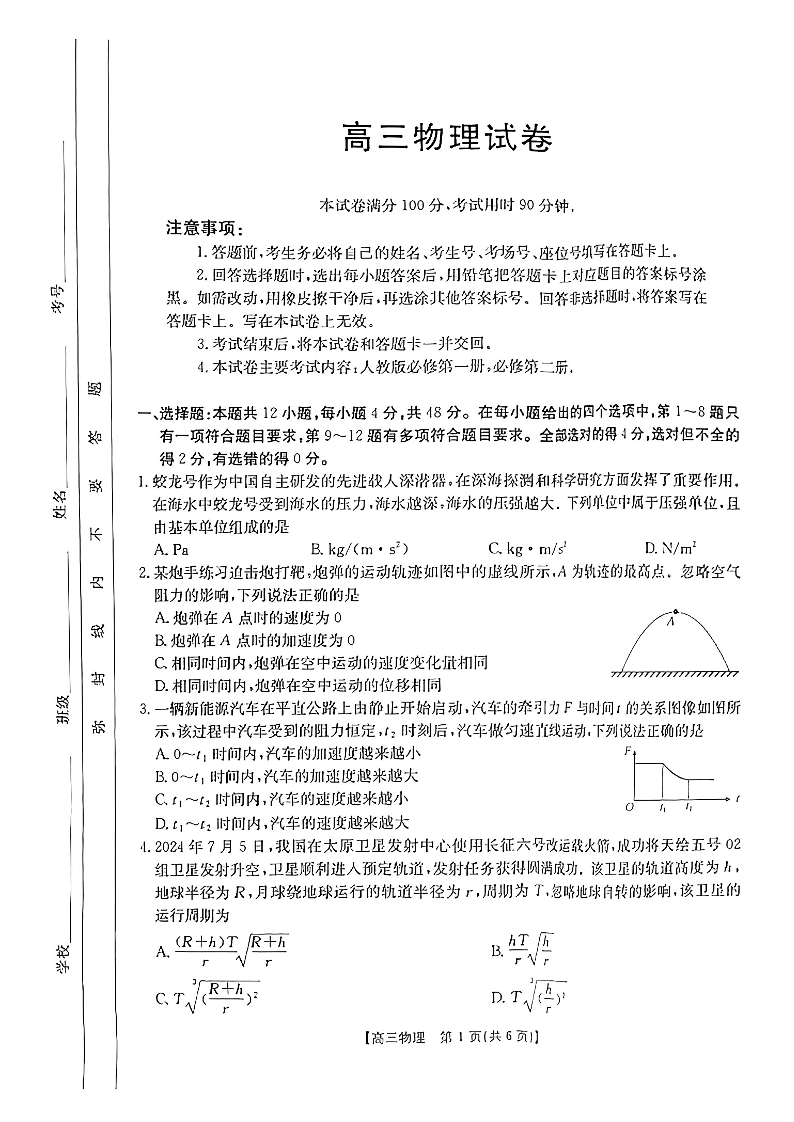 新疆维吾尔自治区片区2025届高三10月联考物理