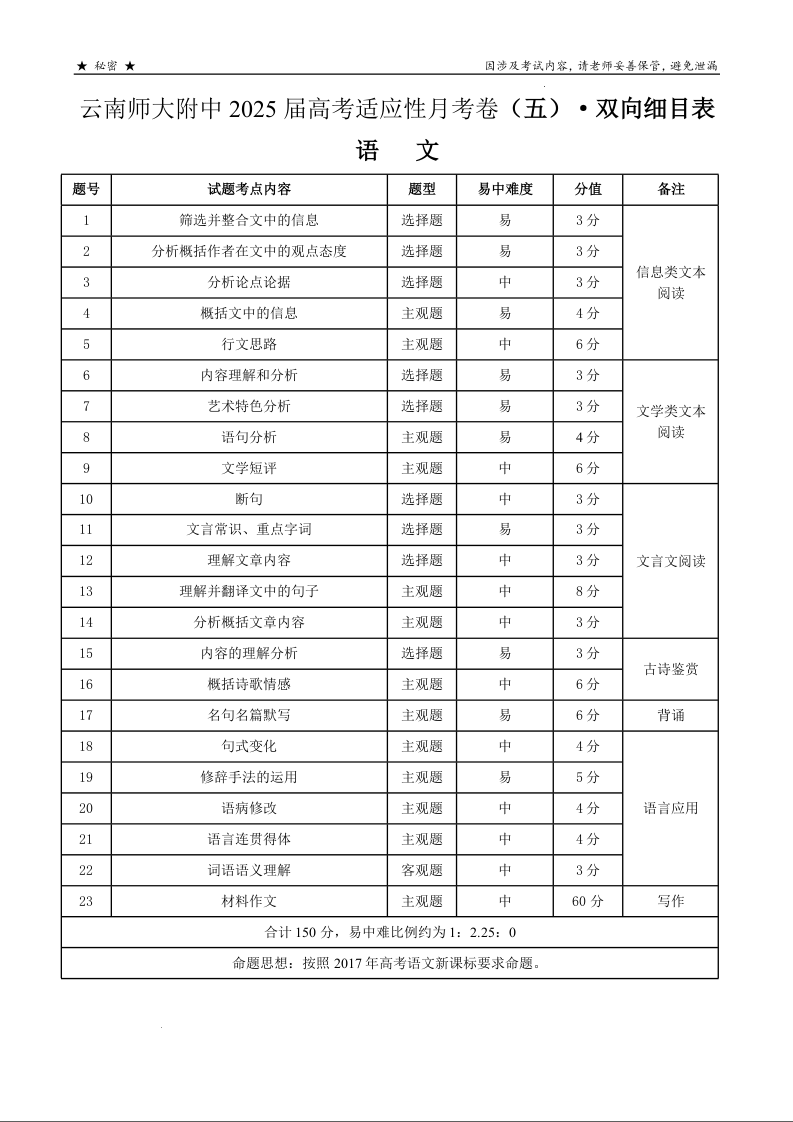 云南师范大学附属中学2025届高三高考适应性月考卷(五)语文双向细目表