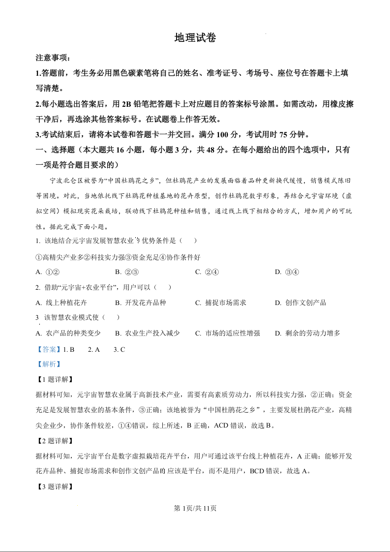 云南师范大学附属中学2025届高三高考适应性月考卷(五)地理(精品解析版)