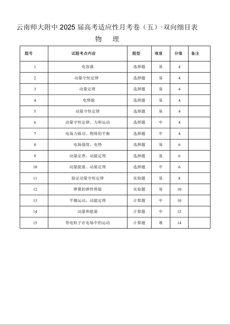 云南师范大学附属中学2025届高三高考适应性月考卷(五)物理(B卷)双向细目表