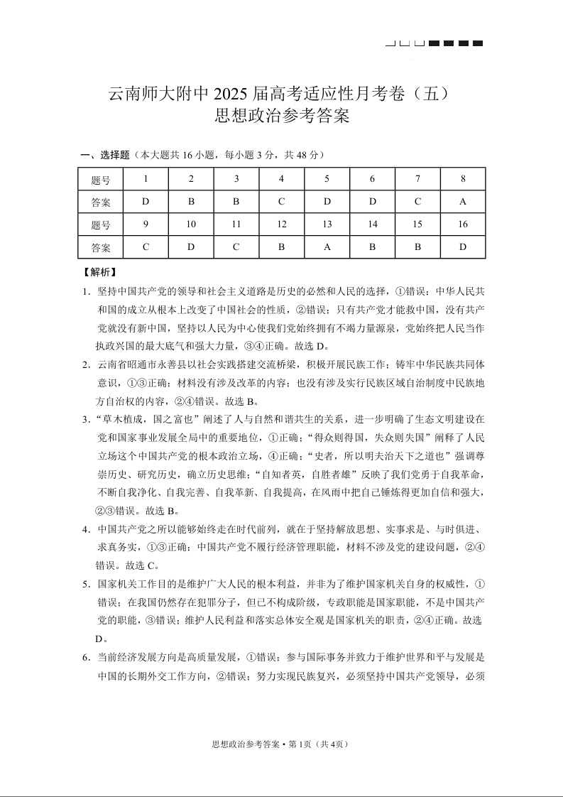 云南师范大学附属中学2025届高三高考适应性月考卷(五)政治(A卷)答案