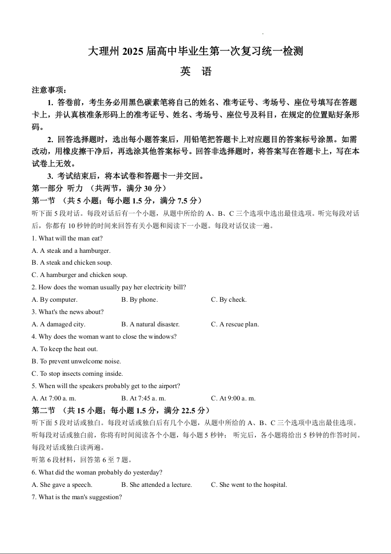 云南省大理州2025届高中毕业生第一次复习统一检测(大理一模)英语+答案