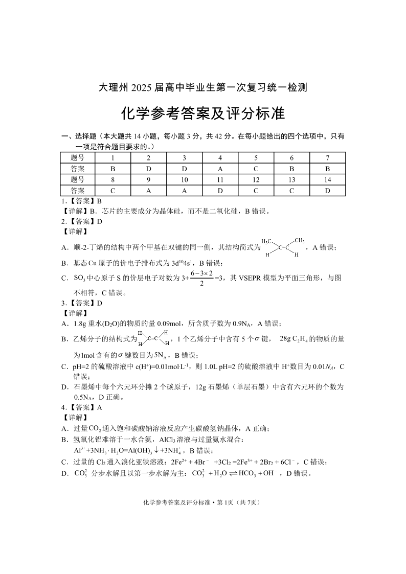 云南省大理州2025届高中毕业生第一次复习统一检测(大理一模)化学答案