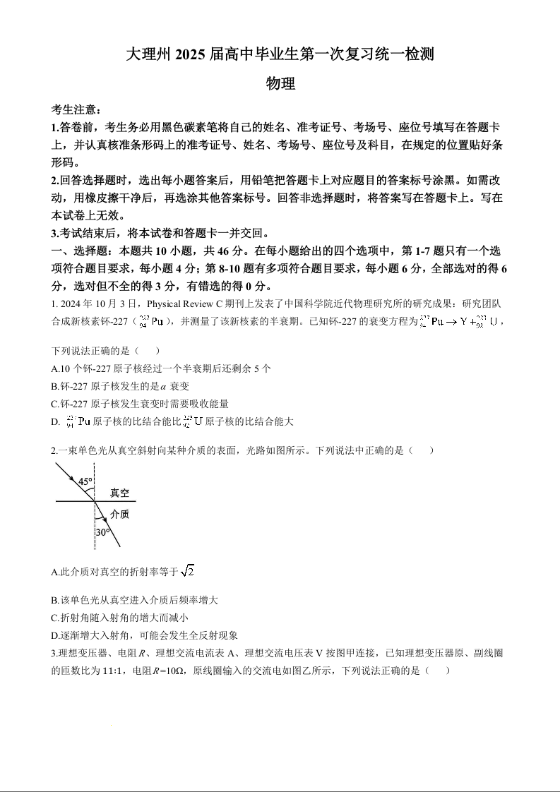 云南省大理州2025届高中毕业生第一次复习统一检测(大理一模)物理+答案
