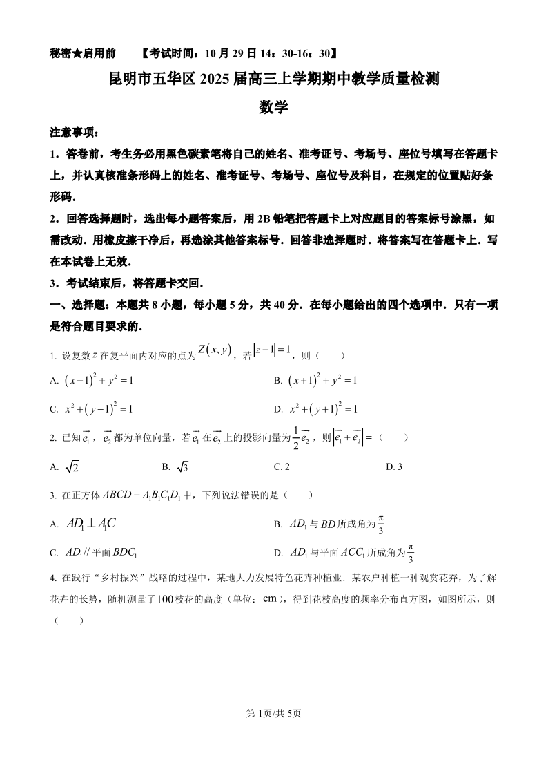 云南省昆明市五华区2024-2025学年高三上学期期中教学质量检测数学(原卷版)