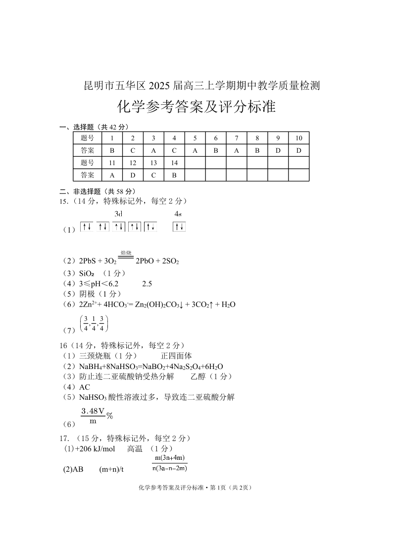 云南省昆明市五华区2024-2025学年高三上学期期中教学质量检测化学答案