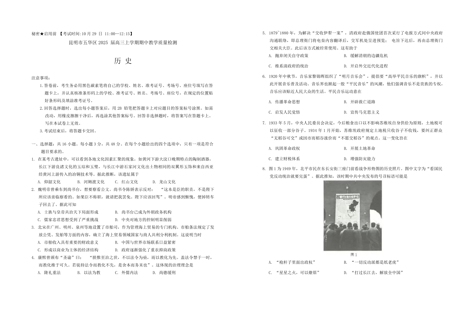 云南省昆明市五华区2024-2025学年高三上学期期中教学质量检测历史