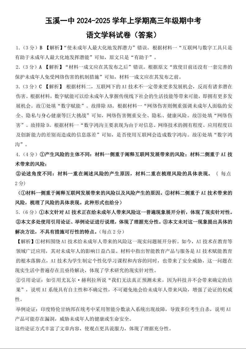 云南省玉溪市一中2025届高三上学期11月期中考试语文答案