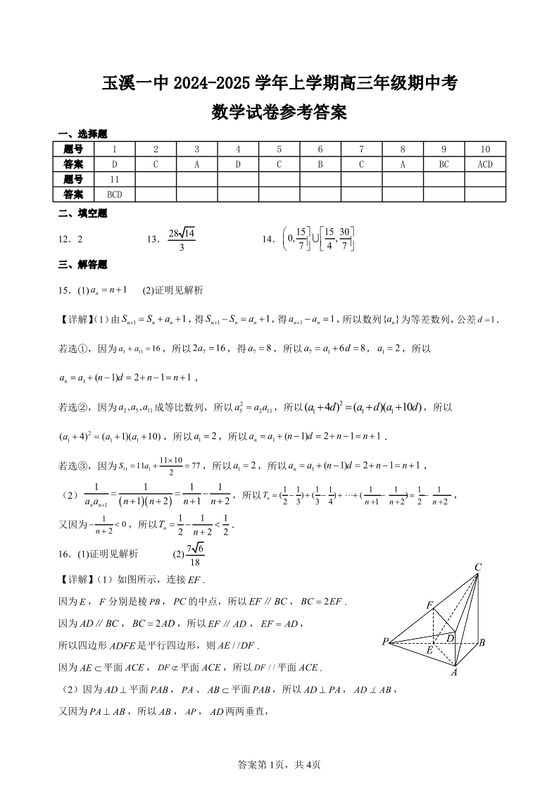 云南省玉溪市一中2025届高三上学期11月期中考试数学答案