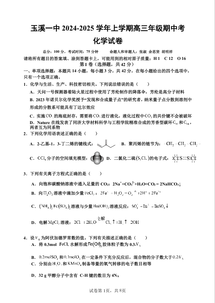 云南省玉溪市一中2025届高三上学期11月期中考试化学+答案