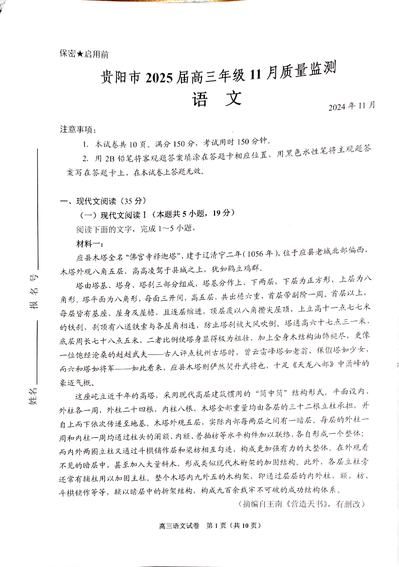 贵州省贵阳市2025届高三年级上学期11月质量监测语文