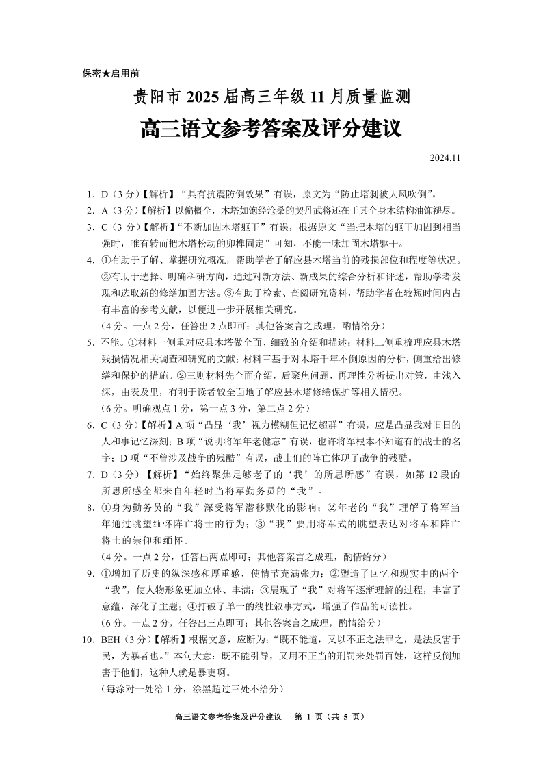 贵州省贵阳市2025届高三年级上学期11月质量监测语文答案