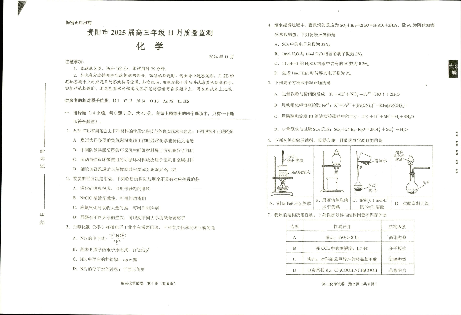 贵州省贵阳市2025届高三年级上学期11月质量监测化学