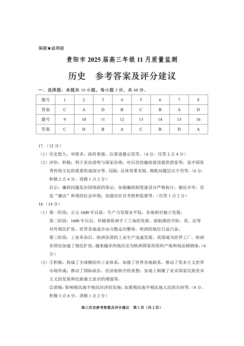 贵州省贵阳市2025届高三年级上学期11月质量监测历史答案