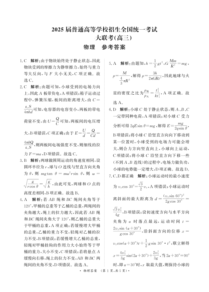 河南省部分重点高中2025届高三年级11月大联考物理答案