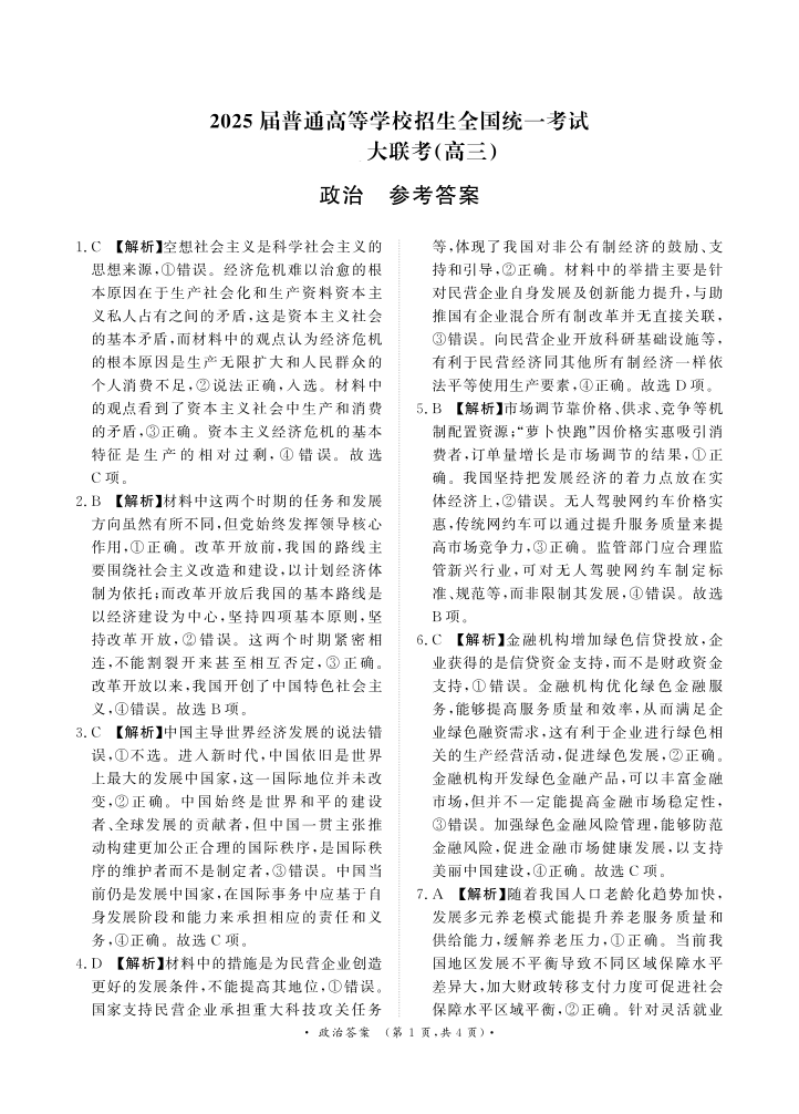 河南省部分重点高中2025届高三年级11月大联考政治答案